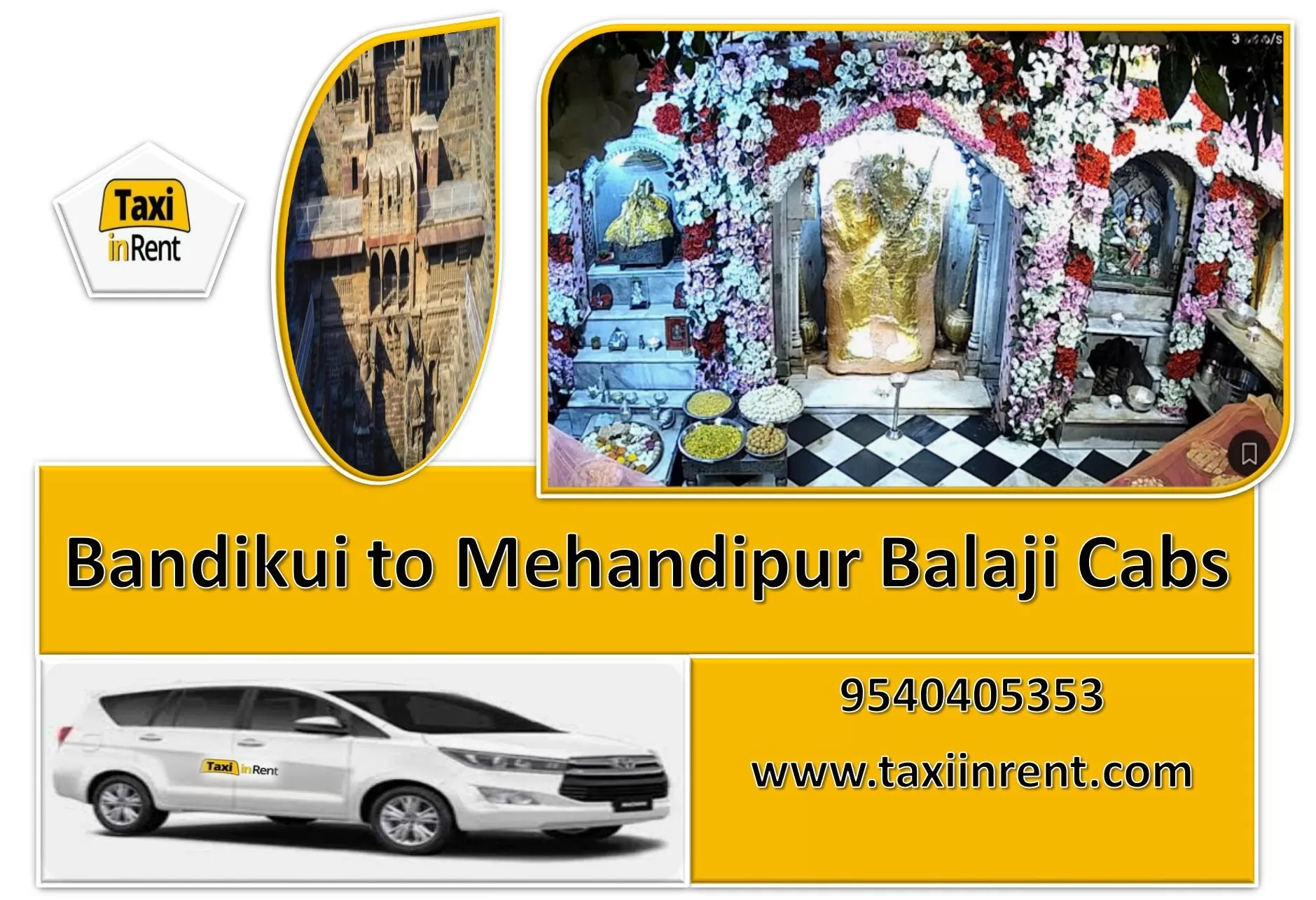 Looking for a Bandikui to Mehandipur Balaji car hire services trip ONE WAY..? For any Quary Call 9540405353 “Taxi in Rent” provides you with this Bandikui to Mehandipur Balaji Car Rental Service at any time. You can also avail of taxi services from Taxi Service Bandikui to Mehandipur Balaji. We provide you with great facilities and timely services. You can book a car from Bandikui to Mehandipur Balaji in the easiest way by visiting our website www.taxiinrent.com. If you are planning to book a Bandikui to Mehandipur Balaji cab you should book with us because we are committed to, a timely, quality, and reliable cab service from Bandikui to Mehandipur Balaji. www.taxiinrent.com For any Quary Call 9540405353, Hotel, Airport, railway station, taxi service bus stand in Bandikui, Airport car hire, Bus stand taxi service, Railway station, one-way Taxi from Bandikui to Mehandipur Balaji, one-way Cab from Bandikui to Mehandipur Balaji, one way Car from Bandikui to Mehandipur Balaji, Bandikui to Mehandipur Balaji one way by car hire, Bandikui to Mehandipur Balaji one way by cab hire, Bandikui to Mehandipur Balaji one way by taxi hire